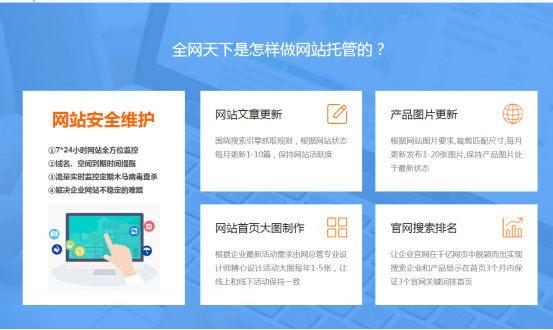 我们都说企业网站是企业的形象担当,其实这样说并不全面,更重要的是客户来源的重要保障。越来越多的企业意识到了网站推广宣传对于企业的重要性,开始找网站托管公司来代运营自己的网站,但是也有一些企业觉得网站托管公司不靠谱,全网天下只能告诉你,那是因为你没有找对网站托管公司,下面就告诉大家如何选择网站托管公司。